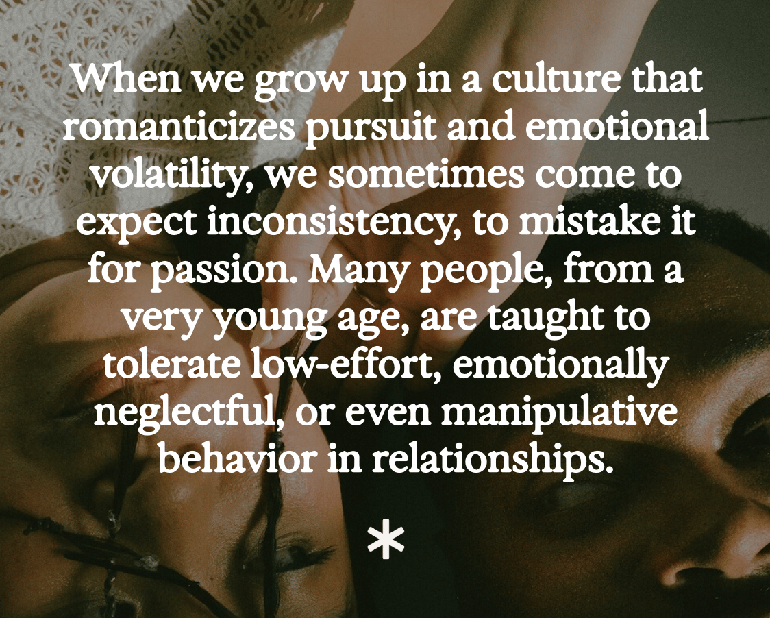 When I was younger, my friends and I thought this kind of inconsistency was just a natural part of dating. We accepted it as normal, even though it often left us confused, anxiously looking at our phones waiting for a text message to pop up and constantly questioning our worth. But the truth is, just because something is common doesn’t mean it’s healthy or acceptable.