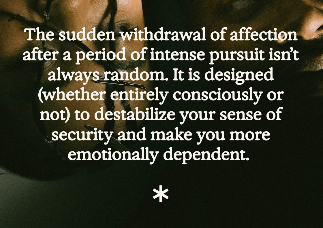 The emotional whiplash of being intensely pursued one day and then ignored the next can leave you constantly seeking validation, wondering what you did wrong, and craving the next "high" of attention. That craving isn’t a reflection of any weakness–it’s a conditioned response to manipulation.
