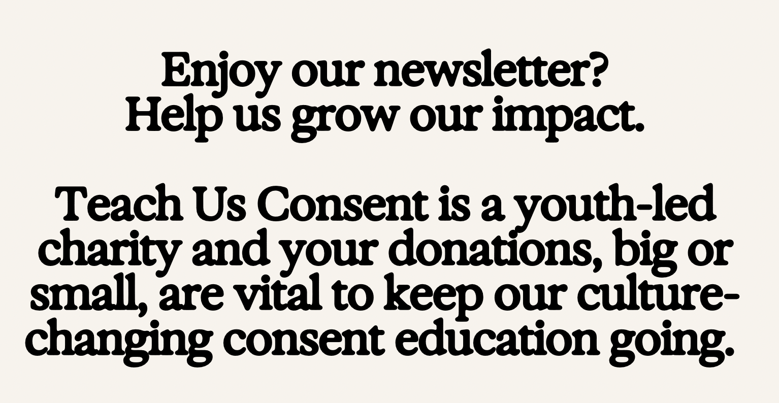 This email has been authorised by Teach Us Consent Global Limited. Consent is revocable, so you can Unsubscribe at any time ABN: 44 653 142 664 ASIC registration: 653 142 664 Registered with the Australian Charities and Not-for-profits Commission Click here to read our privacy policy. Email us: hello@teachusconsent.com
