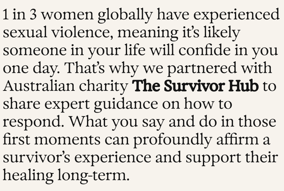 It's important to remember that violence — and someone's response to that violence — doesn't have to look a specific way to be valid. There are many places you can learn more about the experiences of survivors, and how to best be mindful and supportive. However, it is important to question who is delivering these messages, too — ensure the podcast, post or article is coming from a trusted source, and, where possible, consume media created by victim-survivors. This uplifts, platforms and supports survivors' voices. A great example is that every post on The Survivor Hub’s Instagram is written by victim-survivors.