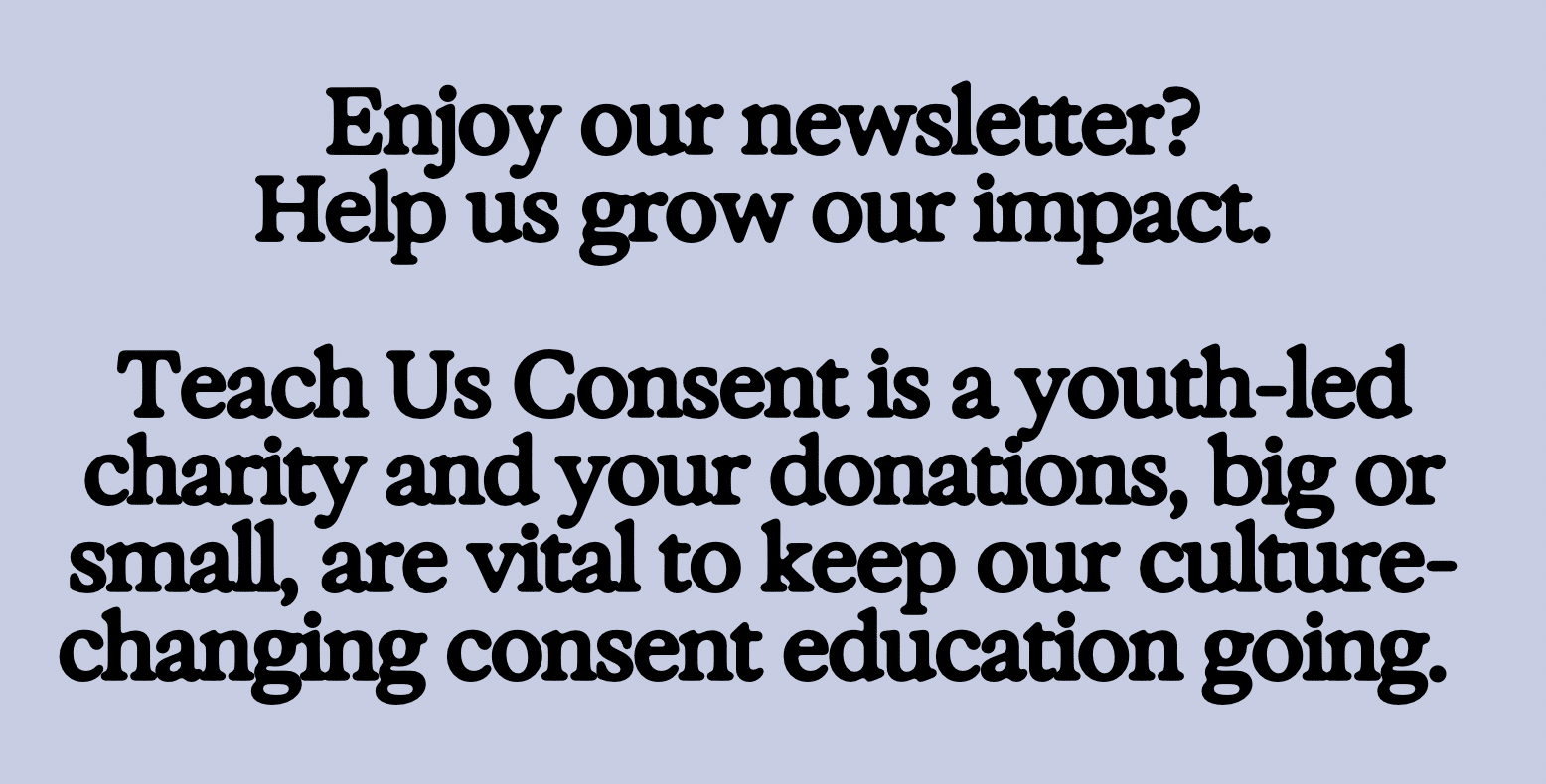 This email has been authorised by Teach Us Consent Global Limited. Consent is revocable, so you can Unsubscribe at any time ABN: 44 653 142 664 ASIC registration: 653 142 664 Registered with the Australian Charities and Not-for-profits Commission Click here to read our privacy policy. Email us: hello@teachusconsent.com