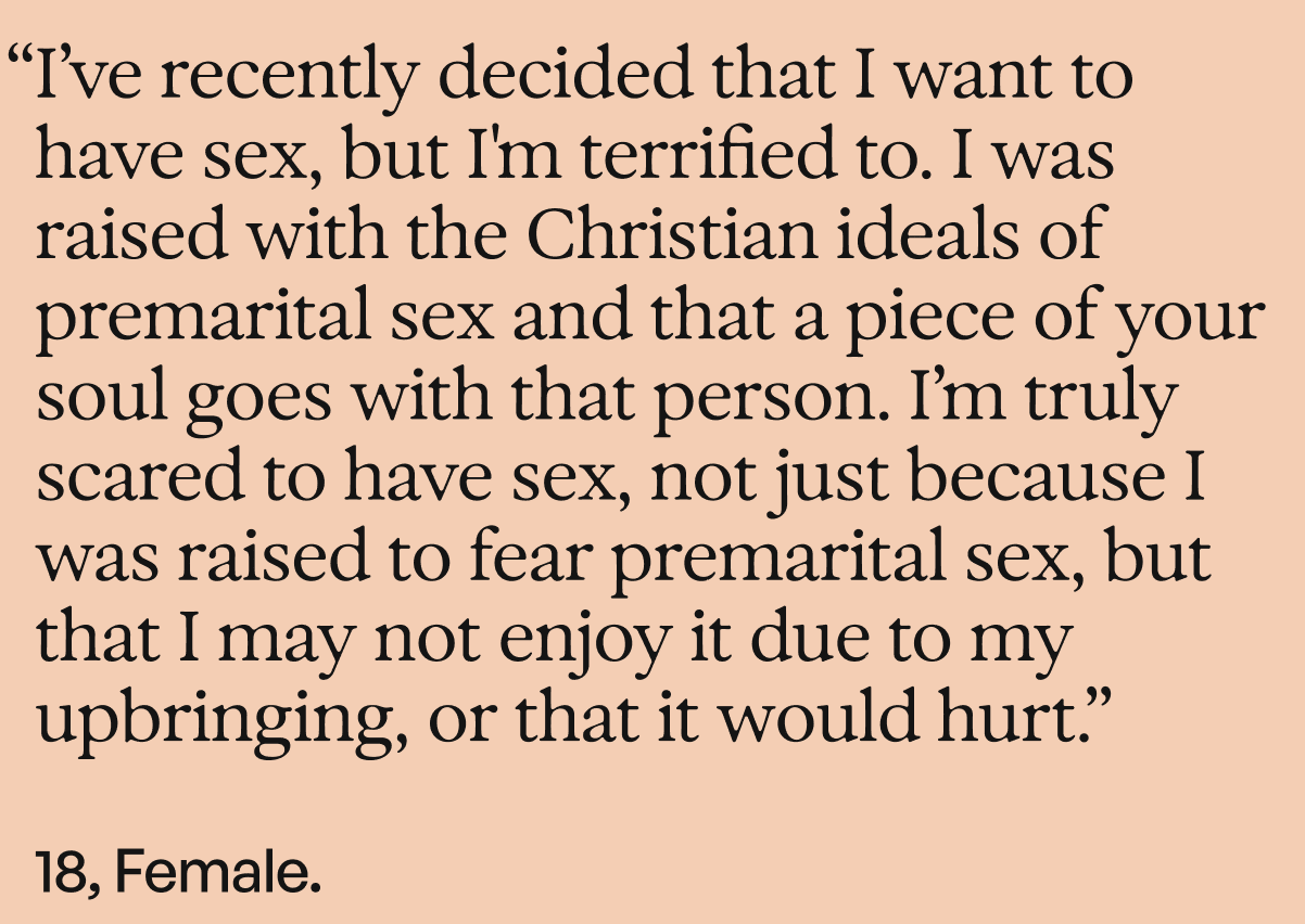 Whether or not your experience with Christianity looked exactly like that, this story reflects a common message in purity culture: that sex before marriage diminishes your worth. These kinds of metaphors, sometimes taught with good intentions, can leave lasting emotional wounds, and a lot of unanswered questions about sex. The idea that a “piece of your soul” goes with each partner can create deep fear, guilt, and shame, especially when you're starting to make your own choices about sex and relationships.