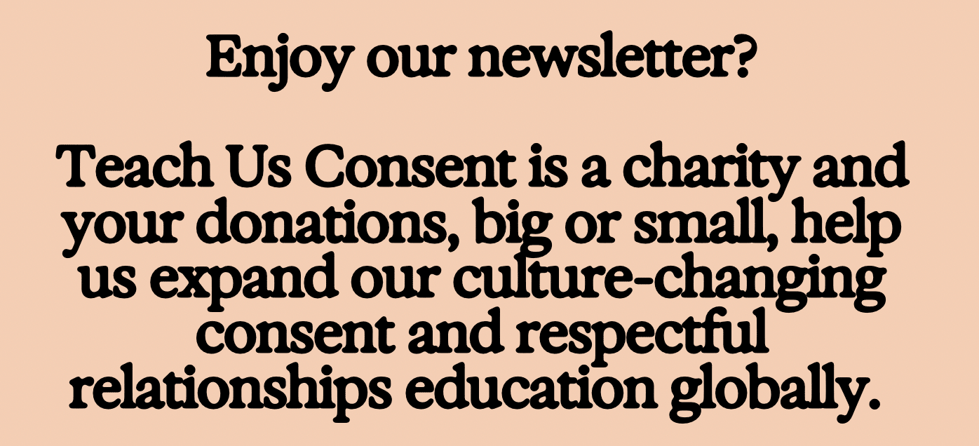 This email has been authorised by Teach Us Consent Global Limited. Consent is revocable, so you can Unsubscribe at any time ABN: 44 653 142 664 ASIC registration: 653 142 664 Registered with the Australian Charities and Not-for-profits Commission Click here to read our privacy policy. Email us: hello@teachusconsent.com