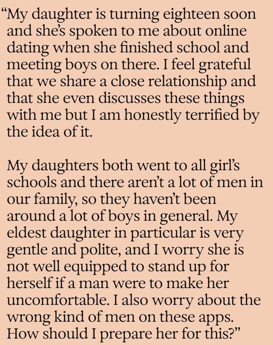 Remind your daughters that even if something doesn’t meet an app’s criteria for “inappropriate behavior” or the law’s criteria for sexual misconduct, it doesn’t mean that what happened was okay. Remind your daughters that you are here for them. While there are old stereotypes about the kinds of people who use dating apps, they’re widespread enough and varied enough that they can be genuinely wonderful tools to help people connect, find community, and find partnerships of all kinds. Take a deep breath and continue to give the care and support to them that you always have.