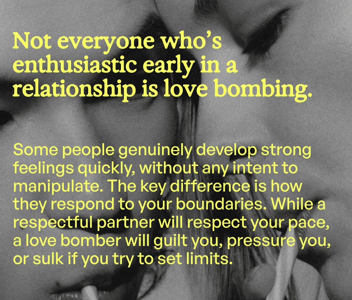 Love bombing is when someone showers you with extreme affection, attention, praise, or gifts very early in a relationship. It might look like over-the-top declarations (“You’re my soulmate!” “I’ve never felt this way before!”) or pressure to move in together or become exclusive after just a few weeks. They might also get upset if you try to pump the brakes or set boundaries, perhaps suggesting it’s because you “don’t care as much as they do.” At first, being the recipient of love bombing can feel exciting and flattering. But beneath the surface, it serves to build immense emotional dependency and loyalty–before you’ve even had the time to properly suss them out.