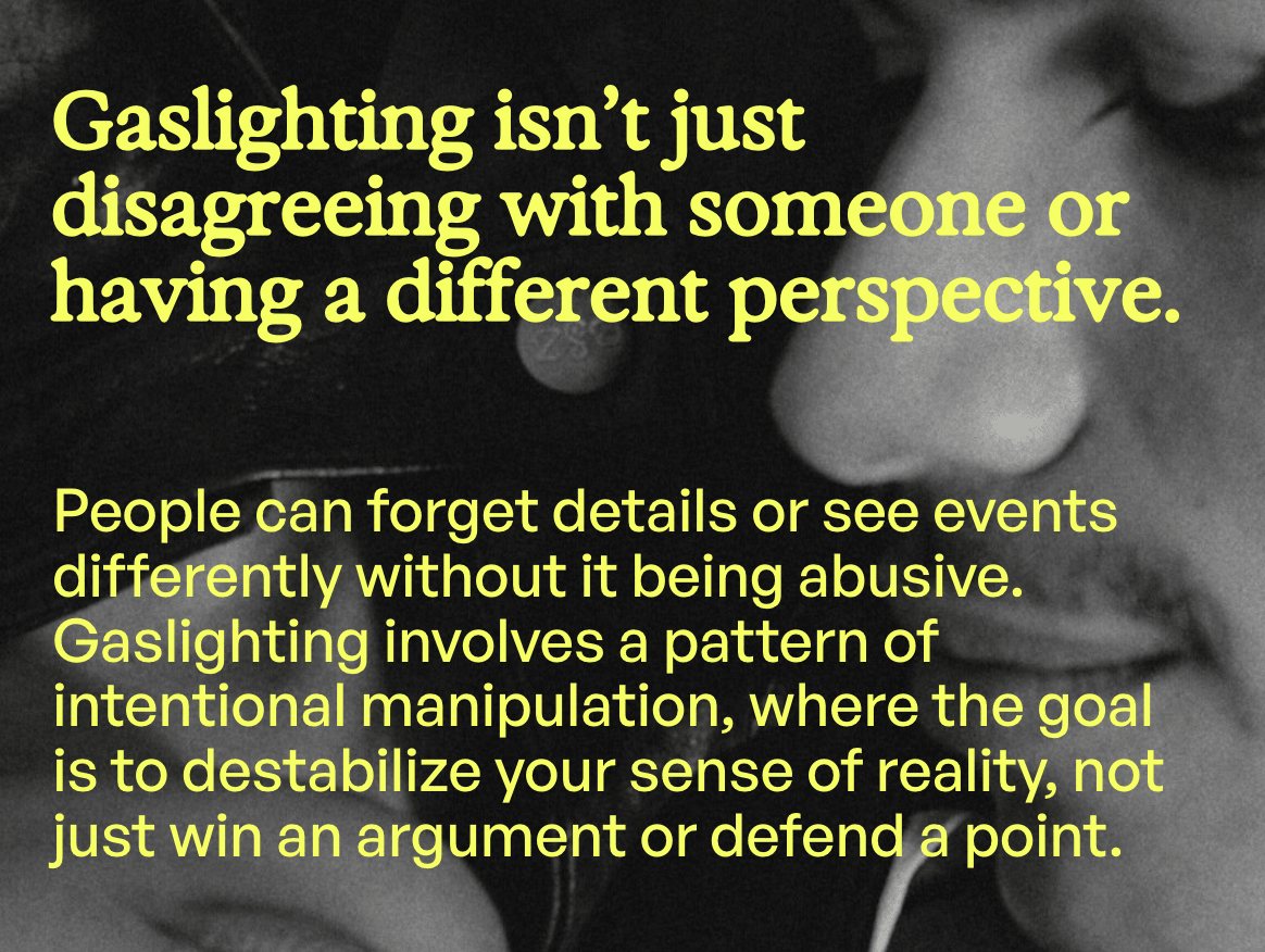 Gaslighting is a deliberate form of emotional manipulation where someone tries to make you doubt your memory, perception, or sanity. They might deny things you know happened ("I never said that"), twist the truth ("You’re just being dramatic"), or blame you for things that aren't your fault. The goal is to make you question your judgement and chip away at your confidence and autonomy, making you more reliant on them. Over time, gaslighting can lead you to second-guess yourself constantly, feel confused about what’s real, and lose trust in your own instincts.